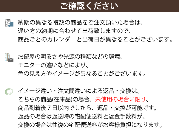 ご注文前に ご確認ください複数の商品をご注文頂いた場合などは、遅い方の納期に合わせて出荷しますので商品ごとのカレンダーと、出荷日が異なる場合があります。詳しい納期についてお部屋の明るさや光源の種類などの環境、モニターの違いにより、色の見え方、イメージが異なることがございます。色の見え方についてイメージ違い・注文間違いによる返品・交換は、こちらの商品の場合、未使用・未開封の場合、商品到着後7日以内でしたら返品・交換が可能です。返品の場合は返送時の送料、交換の場合は往復分の送料がお客様負担になります。返品・交換について 商品の詳細・商品の説明へ メール便についてこちらの商品は、メール便で送ることが出来るサイズを超えているためメール便での発送を行うことができません。