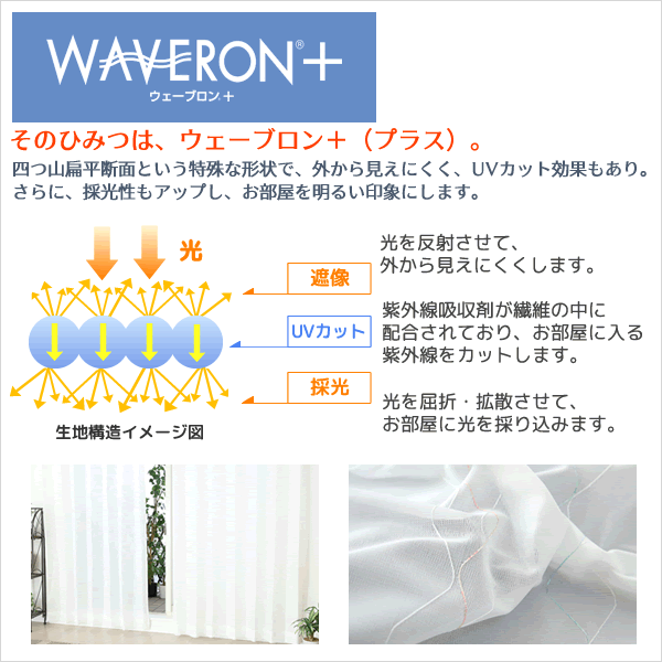 ウェーブロン+(ウェーブロンプラス)という、特殊な繊維構造の糸を使った生地を使ったミラーレースカーテンです。 外から入る光を屈折、拡散させることで、採光性を高め、お部屋の中の印象を明るくします。 光をお部屋の中に採り入れながら、外へ向けても光を反射させることで、 外からの視線や紫外線はしっかりカットし、プライバシー対策や、UV対策にも優れた効果を発揮します。
