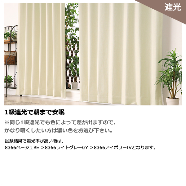 試験結果で遮光率が高い順は、8366ベージュBE >8366ライトグレーGY >8366アイボリーIVです。