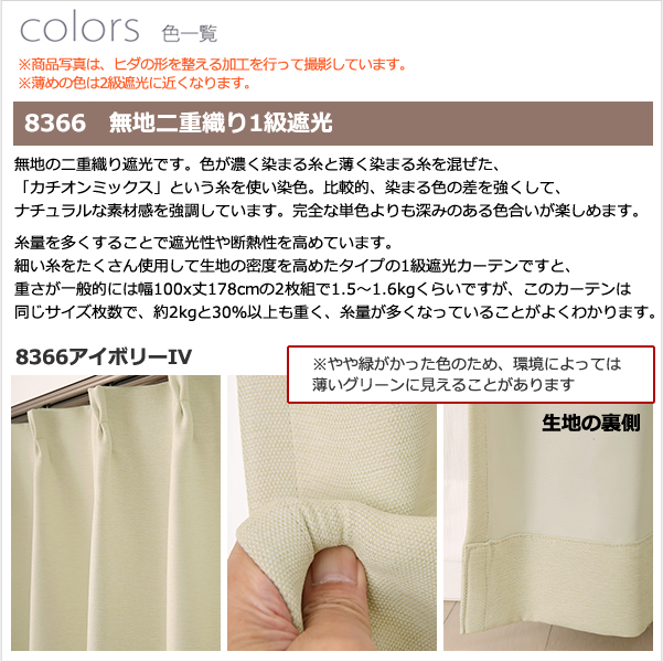 ※同じ1級遮光でも、一般的には薄い色ほど光を通しやすくなっています。 少しでも部屋をより暗くしたい場合は、比較的濃い色をお選び下さい。