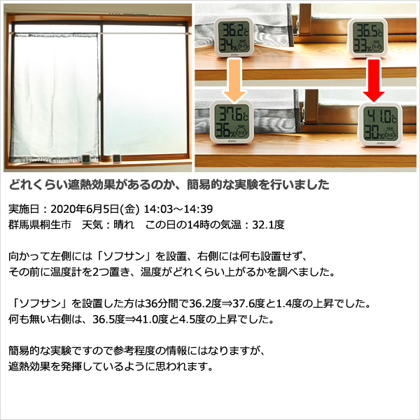 向かって左側には「ソフサン」を設置、右側には何も設置せず、その前に温度計を2つ置き、温度がどれくらい上がるかを調べました。