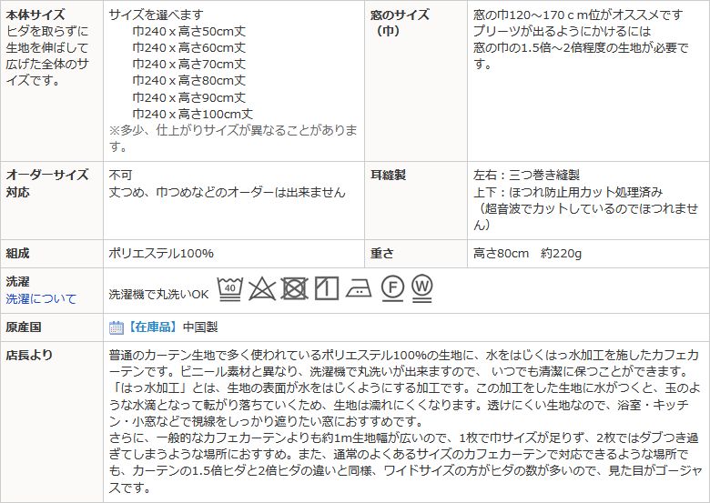 普通のカーテン生地で多く使われているポリエステル100%の生地に、水をはじくはっ水加工を施したカフェカーテンです。