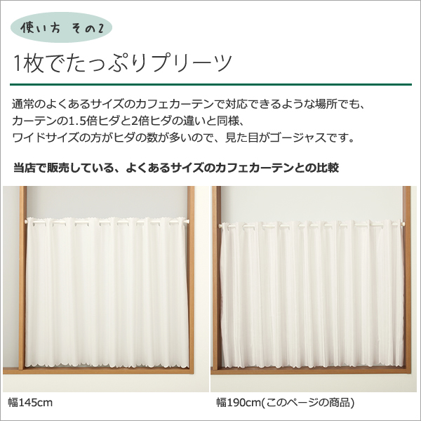 | ↑巾145cmのカフェカーテン | ↑巾190cmのワイドサイズ (このページの商品) |
