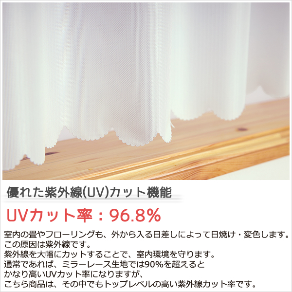 室内の畳やフローリングも、外から入る日差しによって日焼け・変色します。 この原因は紫外線です。紫外線を大幅にカットすることで、室内環境を守ります。 通常であれば、ミラーレース生地では90%を超えるとかなり高いUVカット率になりますが、 この商品は、その中でもトップレベルの高い紫外線カット率です。