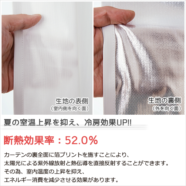 生地の裏全面に箔プリントを施すことにより、 太陽光による紫外線放射と熱伝導を直接反射することができます。 その為、室内温度の上昇を抑え、エネルギー消費を減少させる効果があります。