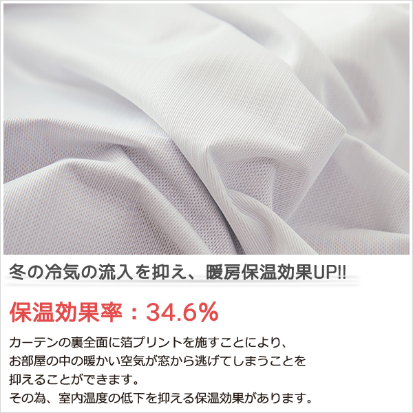 生地の裏全面に箔プリントを施すことにより、 お部屋の中の暖かい空気が窓から逃げてしまうことを抑えることができます。 その為、室内温度の低下を抑える保温効果があります。