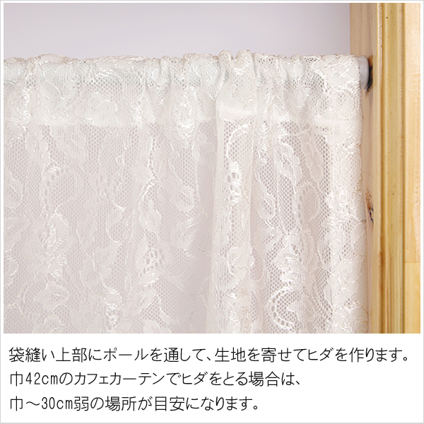 見えにくさ、UVカットというような機能的な部分を売りにできるカフェカーテンではありませんが、レース本来の魅力を、より多く伝えられるのは、このようなカフェカーテンだと思います。