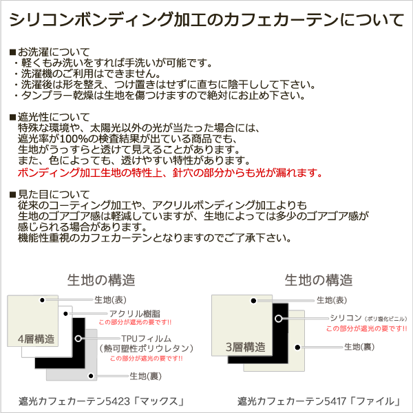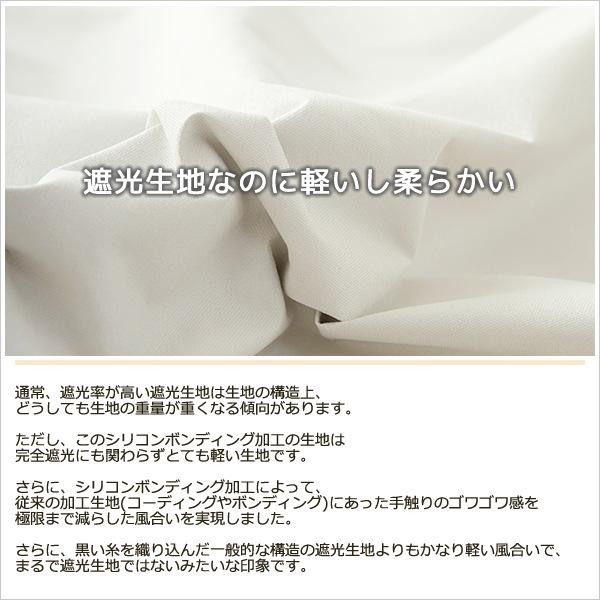 シリコンボンディング加工によって、従来の加工生地(コーディングやボンディング)にあった 手触りのゴワゴワ感を極限まで減らした風合いを実現しました。 従来の加工生地(コーディングやボンディング)や、 黒い糸を織り込んだ一般的な構造の遮光生地よりもかなり軽くて、 まるで遮光生地ではないみたいな印象です。