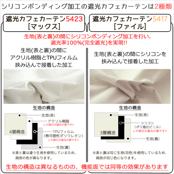 生地(表と裏)の間にシリコンボンディング加工を行い、 遮光率100%(完全遮光)を実現しました。 「1級遮光」の基準は遮光率99.99%以上。 その中でも、この生地はなんと遮光率100%(完全遮光)と最も高い遮光性です。