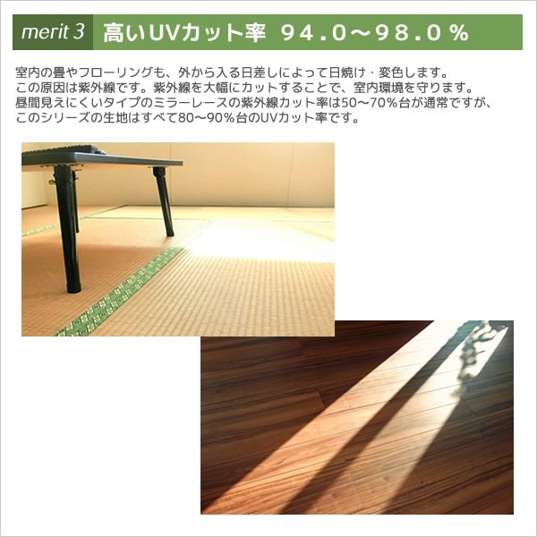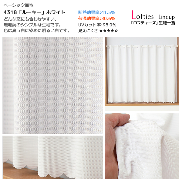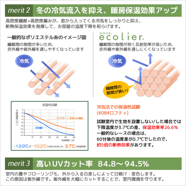 | 店長より | 大好評の断熱レースミラーカーテン「ロフティーズ」シリーズのカフェカーテンです。 帝人ファイバーの「エコリエ」という特殊な金属酸化物配合の断熱糸を採用。 夏は太陽熱を反射させ、暑く眩しい日差しを抑え、お部屋の温度上昇を和らげます。 冬は窓から入ってくる冷気をしっかりと抑え、断熱保温効果を発揮して、お部屋の温度下降を和らげます。 一般的なレースカーテン生地と比較して、夏は約2倍・冬は3〜4倍の断熱効果があります。 とても高密度に編み上げることで、UVカット率も高くなり、夜電気をつけても外から見えにくくなっています。 その分、通常のレースカーテンと比べると、かなり厚みのある生地になります。 |