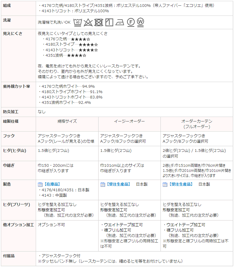 | 付属品 | ・アジャスターフック付 ※タッセルバンド無し(レースカーテンには、纏めるヒモ等をお付けしていません) 別売りのタッセルもあります |