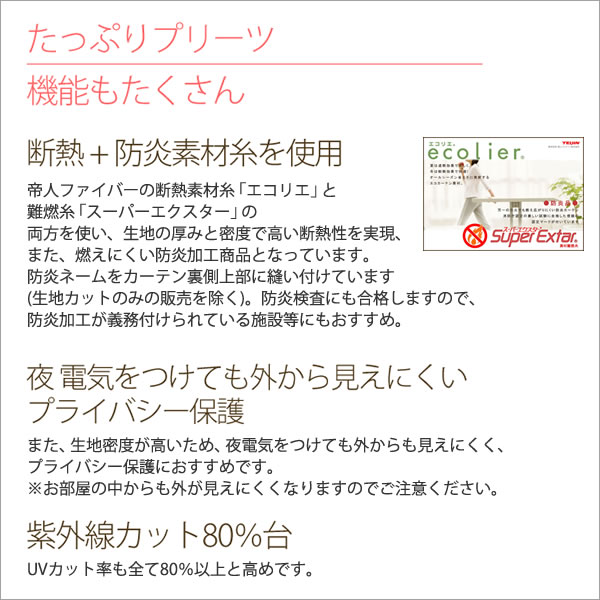 ![]() 一般的にカーテンの生地は150cm幅が多いのですが、このページの生地はすべて200cm幅です。 例えば、幅100cmのカーテンを作る場合の基本的な考えは、150cm幅の生地を「1.5倍」仕様でヒダを取って、幅100cmに仕上げるというものです(幅100cmのカーテンを作るのに、1.5倍のサイズの生地を使うので「1.5倍ヒダ」と言います)。この考えを200cm幅の生地に当てはめますと、幅100cmの2倍のサイズの生地なので、カーテンを「2倍ヒダ」仕様で仕上げることができる、ということになります。 一般的には200cm幅の生地はオーダーカーテン専用で使うことも多いのですが、このページの商品については、既製品も含めたすべての仕様で2倍ヒダを標準仕様として採用しました。 ヒダの数が多いことは、一番わかりやすい見た目のメリットです。 それでも価格は出来るだけ抑えて、お求めやすく致しました。 もしまだでしたら、お気軽に2倍ヒダを始めてみませんか。 縫製仕様について ![]() 帝人ファイバーの断熱素材糸「エコリエ」と難燃糸「スーパーエクスター」の両方を使い、生地の厚みと密度で高い断熱性を実現、また、燃えにくい防炎加工商品となっています。防炎ネームをカーテン裏側上部に縫い付けています(生地カットのみの販売を除く)。防炎検査にも合格しますので、防炎加工が義務付けられている施設などにもおすすめできます。 防炎加工について ![]() また、生地密度が高いため、夜電気をつけても外からも見えにくくなりました。 プライバシー保護におすすめです。 ※お部屋の中からも外が見えにくくなりますのでご注意ください。 ![]() UVカット率も全て80%以上と高めです。 |