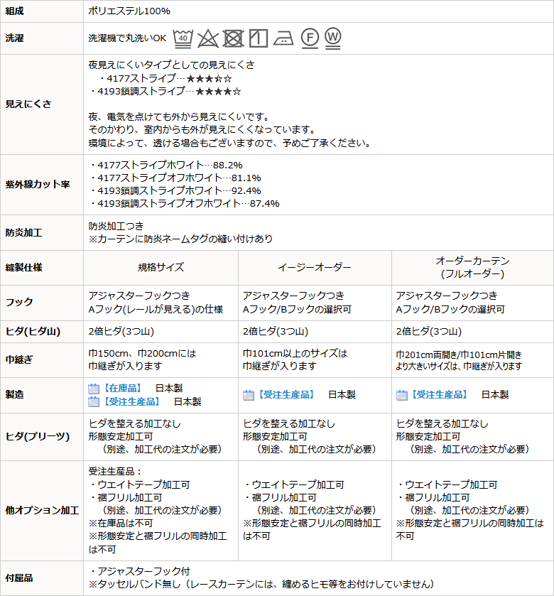 | 紫外線カット率 | ・4177ストライプホワイト…88.2% ・4177ストライプオフホワイト…81.1% ・4193鎖調ストライプホワイト…92.4% ・4193鎖調ストライプオフホワイト…87.4% |