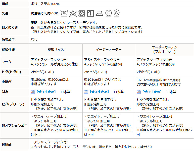 | ヒダ(プリーツ) | ヒダを整える加工なし 形態安定加工可 (別途、加工代の注文が必要) |