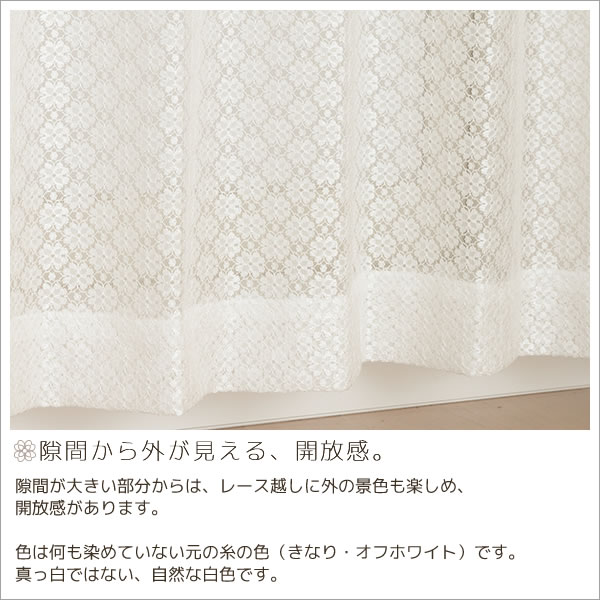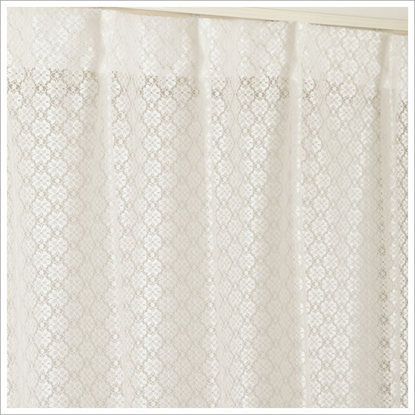 | 店長より | 細い糸を荒く編んだ、隙間が大きな地の部分と、クリンプ糸という、 太めに撚った糸で編んだ、光る小花の部分と、 その中間程度の編みで小花の花びらを表した部分。 この3つの要素でたくさんの小花柄が作られています。 夜もお部屋の電気などが当たると花びらが 光って見えて高級感があります。 機能的な部分を 売りにできるレースカーテンではありませんがレース本来の魅力を より多く伝えられるレースカーテンだと思います。 |