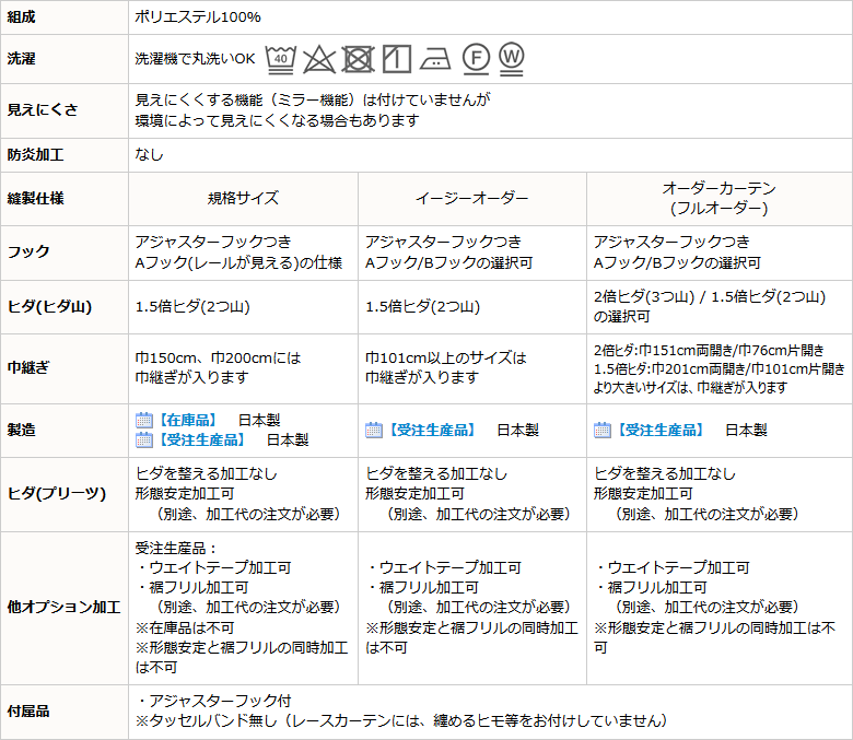 | ヒダ(プリーツ) | ヒダを整える加工なし 形態安定加工可 (別途、加工代の注文が必要) |