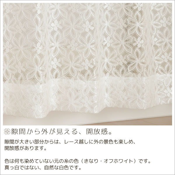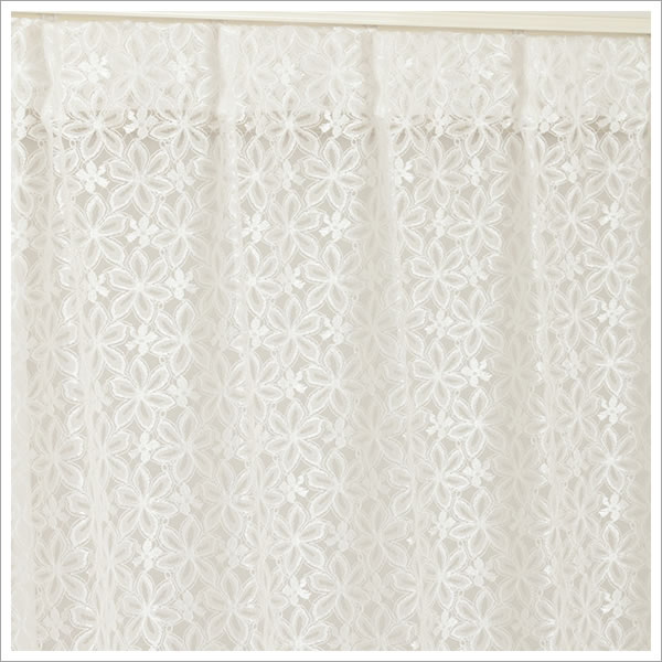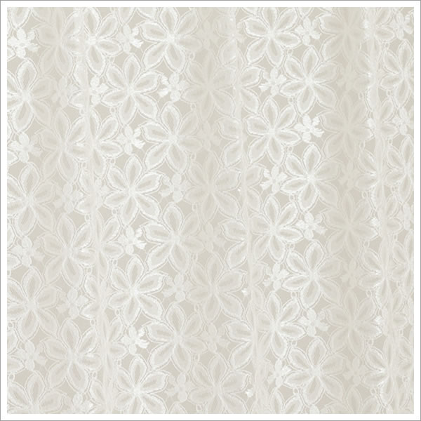 | 店長より | 細い糸を荒く編んだ、隙間が大きな地の部分と、クリンプ糸という、 太めに撚った糸で編んだ、光る花の部分と、 その中間程度の編みで花の花びらを表した部分。 この3つの要素でたくさんの花柄が作られています。 夜もお部屋の電気などが当たると花びらが 光って見えて高級感があります。 機能的な部分を 売りにできるレースカーテンではありませんがレース本来の魅力を より多く伝えられるレースカーテンだと思います。 |