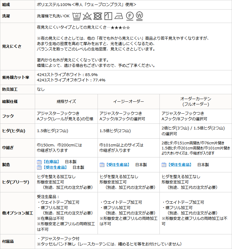 | 紫外線カット率 | 4243ストライプホワイト:85.9% 4243ストライプオフホワイト:77.4% |