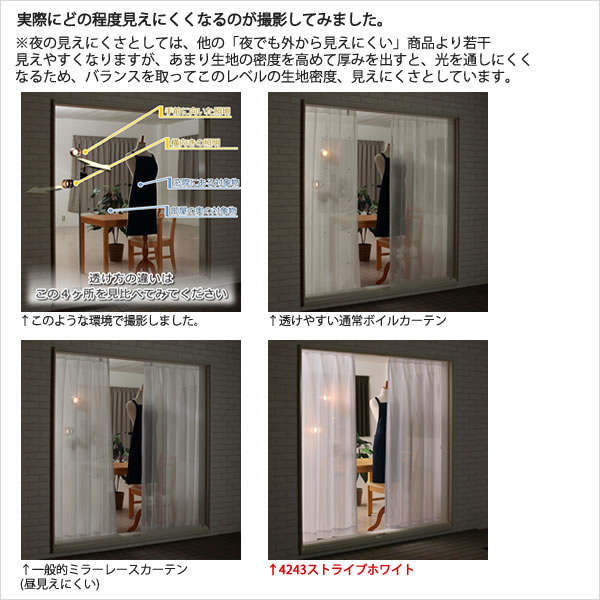 夜見えにくいタイプとしての見えにくさ…![]() 夜、電気を点けても外から見えにくいです。 そのかわり、室内からも外が見えにくくなっています。 環境によって、透ける場合もございますので、予めご了承くださいませ。 |