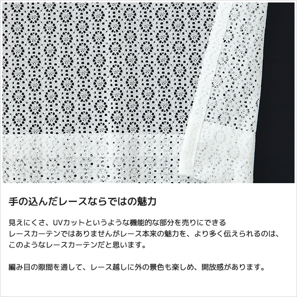 | 店長より | レース編みの魅力がたっぷりのレースカーテン。直径2cm弱のかわいい小花をモチーフにしたようなドット柄がたくさん並んでいます。遠目にみれば、幾何学模様のレース生地に見え、また違った印象に見えるかもしれません。近くで見れば愛らしさ、遠目には規則正しい柄パターンが強調されて見え、さまざまな印象を感じられるデザインがとても素敵です。見えにくさ、UVカットというような機能的な部分を売りにできるレースカーテンではありませんがレース本来の魅力を、より多く伝えられるのは、このようなレースカーテンだと思います。編み目の隙間を通して、レース越しに外の景色も楽しめ、開放感があります。色は白く染めていますが「真っ白」というよりは、キナリに近い自然な白です。アジャスターフックが付いていますので、レールにすぐ簡単に取り付けられます。 | ||