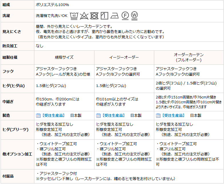 | ヒダ(プリーツ) | ヒダを整える加工なし 形態安定加工可 (別途、加工代の注文が必要) |
