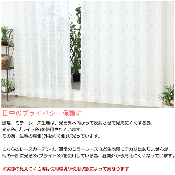 柄を美しく際立たせつつ、やわらかな光をお部屋に届けます。 また、一部の柄にグレーの糸を使用しています。 グレーの糸が加わることで、派手すぎずシックな雰囲気になり、 ナチュラル・モダン・北欧風など幅広いテイストのインテリアに馴染みやすくなっています。 「UVカット率:71.6%(厚地部分)/61.5%(薄地部分)」 こちらのレース生地は、目が詰まった部分と少々透け感のある部分を組み合わせたデザインです。 その為、厚地になっている部分71.6%、薄地になっている部分が61.5%とUVカット率が異なります。 昼間外から見えにくいミラーレースは通常50?60%台のUVカット率が多いので、 全体的に高い数字と言えます。デザインを重視しつつ、 紫外線対策も考慮したい方におすすめです。 通常、ミラーレース生地は、光を外へ向かって反射させて見えにくくする為、 光る糸(ブライト糸)を使用されています。その為、生地の裏側(外を向く側)が光っています。 こちらのレースカーテンは、通常のミラーレースほど生地裏にテカリはありませんが、 柄の一部に光る糸(ブライト糸)を使用している為、昼間外から見えにくくなっています。 |