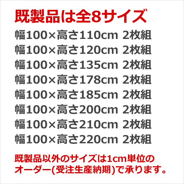 | 巾継ぎ 巾継ぎについて | 巾150cm、巾200cmには 巾継ぎが入ります | 巾101cm以上のサイズは 巾継ぎが入ります | 2倍ヒダ:巾151cm両開き/巾76cm片開き 1.5倍ヒダ:巾201cm両開き/巾101cm片開き より大きいサイズは、巾継ぎが入ります |
