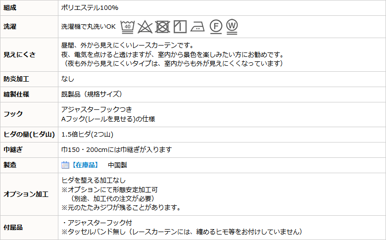 | 付属品 | ・アジャスターフック付 ※タッセルバンド無し(レースカーテンには、纏めるヒモ等をお付けしていません) 別売りのタッセルもあります |