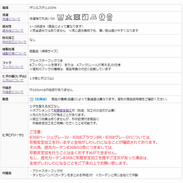 | ヒダ(プリーツ) | ヒダを整える加工なし ※オプションにて形態安定加工可(別途、加工代の注文が必要) ※元のたたみジワが残ることがあります。 ※目立つ効果はありませんが、形状記憶付き商品に 形態安定加工をご依頼いただくことも可能です。 ご注意: 8368ベージュグレーIV・8368ブラウンBR・8368グレーGYについては、 形態安定加工を行いますと生地がしわしわになることが確認されております。 その為、遮光カーテン8368の3色につきましては、 形態安定加を行うことは全くおすすめができません。 もし、遮光カーテン8368に形態安定加工を施すご注文があった場合は、 生地がしわしわになることをご了承の上でお願い致します。 |