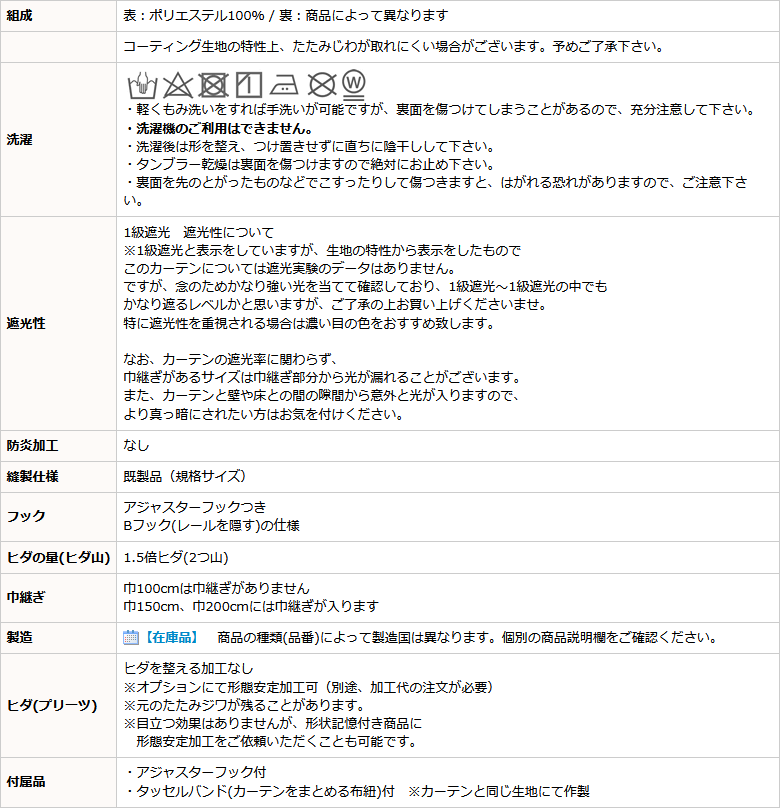 | ヒダ(プリーツ) | ヒダを整える加工なし ※オプションにて形態安定加工可(別途、加工代の注文が必要) ※元のたたみジワが残ることがあります。 ※目立つ効果はありませんが、形状記憶付き商品に 形態安定加工をご依頼いただくことも可能です。 |