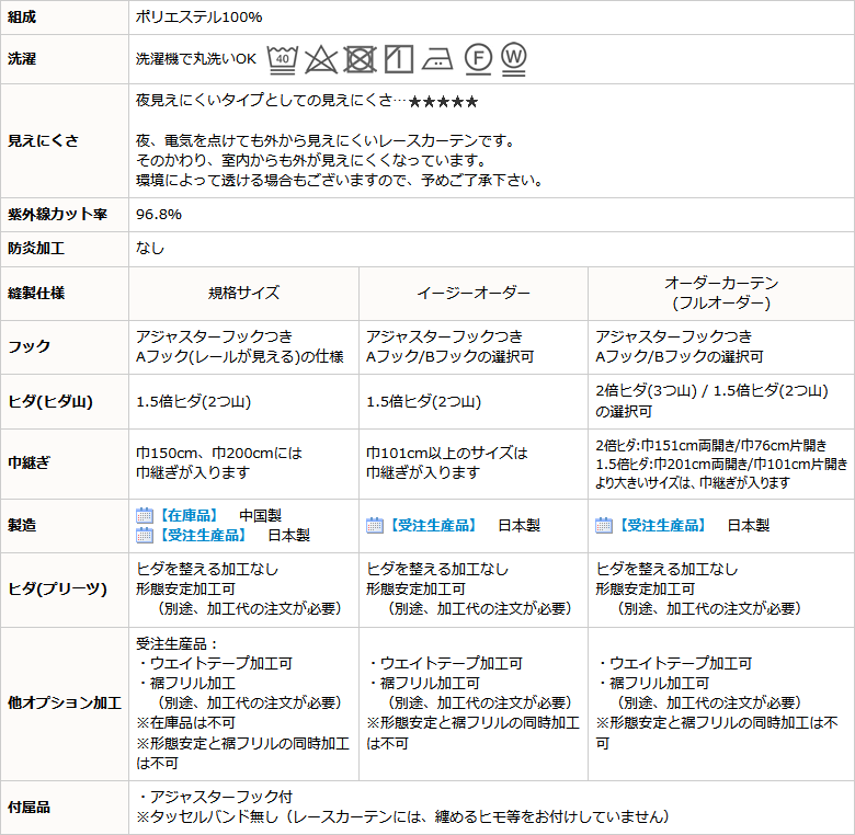 | 付属品 | ・アジャスターフック付 ※タッセルバンド無し(レースカーテンには、纏めるヒモ等をお付けしていません) 別売りのタッセルもあります |