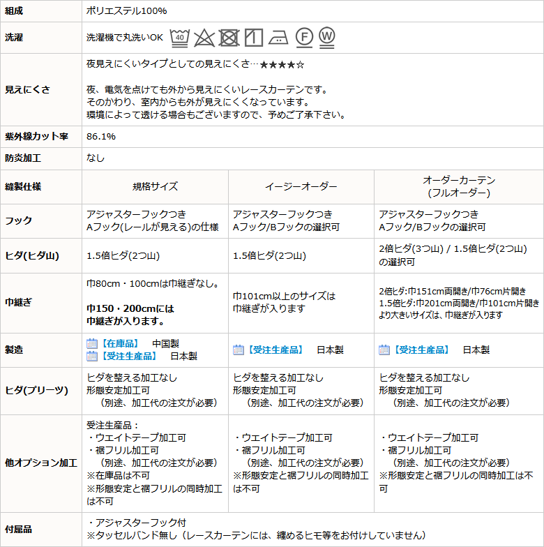 | ヒダ(プリーツ) | ヒダを整える加工なし 形態安定加工可 (別途、加工代の注文が必要) |