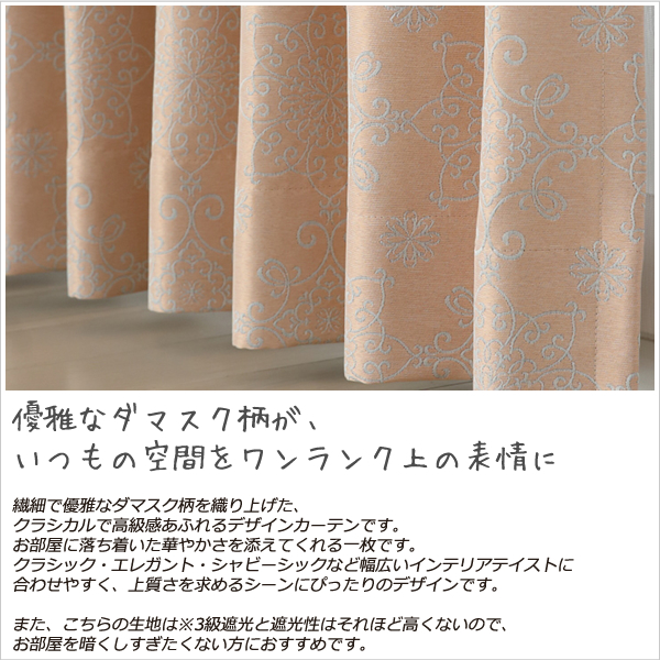 繊細で優雅なダマスク柄を織り上げた、クラシカルで高級感あふれるデザインカーテンです。