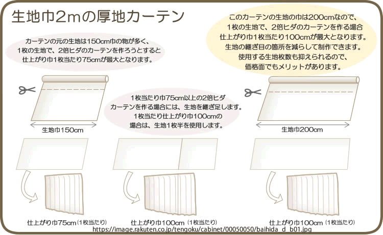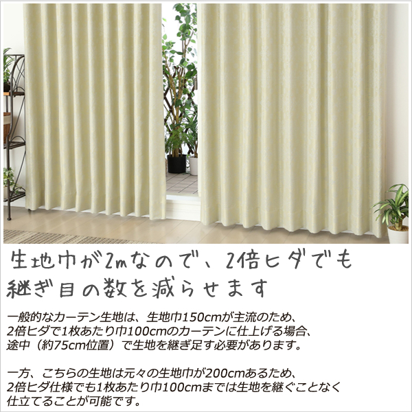 一般的なカーテン生地は、生地巾150cmが主流のため、2倍ヒダで1枚あたり巾100cmのカーテンに仕上げる場合、途中(約75cm位置)で生地を継ぎ足す必要があります。