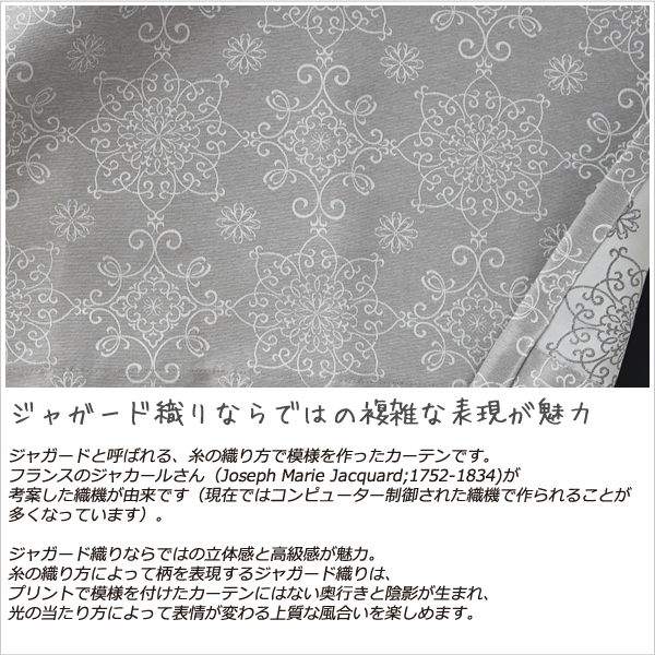 ジャガードと呼ばれる、糸の織り方で模様を作ったカーテンです。