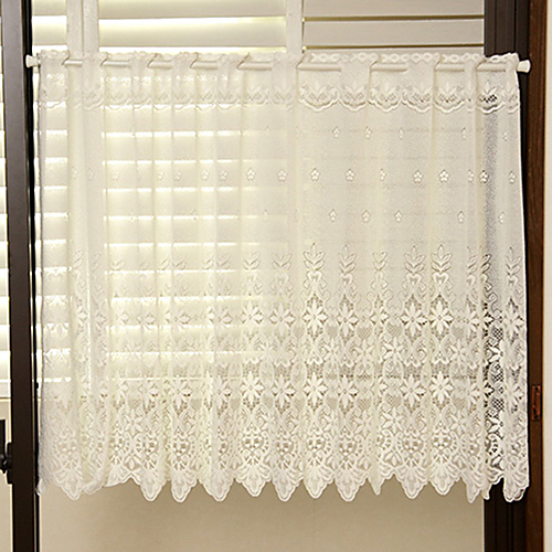 | 店長より | これぞカフェカーテン、といった雰囲気の、エレガントな織り柄のカフェカーテンです。 厚みのあるレース生地になっています。トイレ 収納 目隠し 棚 | ||