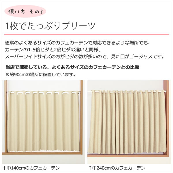 | ↑巾140cmのカフェカーテン | ↑巾240cmのワイドサイズのカフェカーテン(このページの商品) |