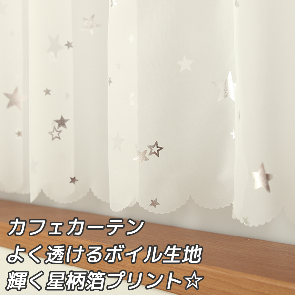 ★カフェカーテン 星柄 輝く箔プリント 良く透けるボイル生地 2492星柄箔プリントSV 星 スター 子供部屋 巾(幅)145×高さ45・70cm丈 1枚入【在庫品】メール便可(1枚まで) [2492cafe]