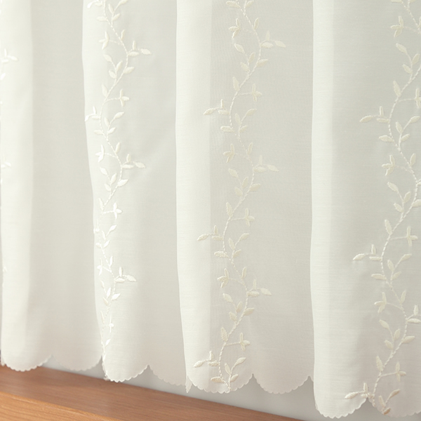 ★カフェカーテン 2494刺繍ストライプオフホワイト 良く透けるボイル生地 小枝 ボタニカル 巾(幅)145×高さ45・70cm丈 1枚入【在庫品】メール便可(1枚まで) [2494cafe]