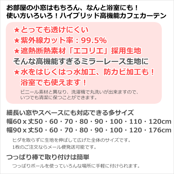 ★送料無料 カフェカーテン レース ナローサイズ 細幅 ミラー UVカット率99.5% 外から見えにくい 断熱 遮熱 保温 はっ水 防カビ加工 浴室 お風呂 4294 巾(幅)60・90×高さ(丈)50・60・70・80・90・100・120cm 1枚入【在庫品】メール便可(1枚まで) [4294cafenarrow]