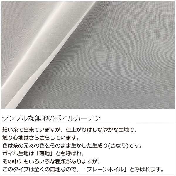 ![]() 細い糸で出来ていますが、仕上がりはしなやかな生地で、触り心地はさらさらしています。 色は糸の元々の色をそのまま生かした生成り(きなり)です。 ボイル生地は「薄地」とも呼ばれ、その中にもいろいろな種類がありますが、 このタイプは全くの無地なので、「プレーンボイル」と呼ばれます。 |