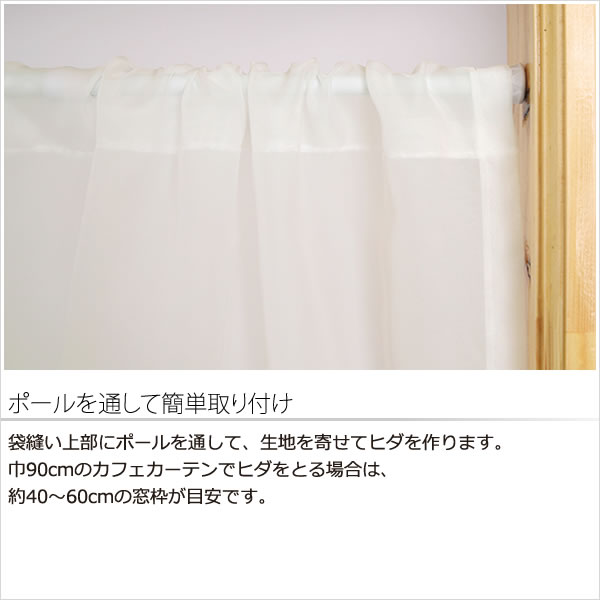 ![]() 袋縫い上部にポールを通して、生地を寄せてヒダを作ります。 各巾サイズの目安となる窓枠内のサイズ ・巾サイズ42cmのカフェカーテンの場合、窓枠内の横の長さ 約〜30cm ・巾サイズ60cmのカフェカーテンの場合、窓枠内の横の長さ 約30〜40cm ・巾サイズ90cmのカフェカーテンの場合、窓枠内の横の長さ 約40〜60cm ・巾サイズ142cmのカフェカーテンの場合、窓枠内の横の長さ 約60〜100cm |