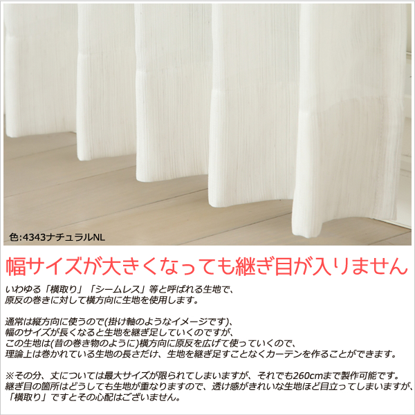 通常は縦方向に使うので(掛け軸のようなイメージです)、幅のサイズが長くなると生地を継ぎ足していくのですが、 この生地は(昔の巻き物のように)横方向に原反を広げて使っていくので、 理論上は巻かれている生地の長さだけ、生地を継ぎ足すことなくカーテンを作ることができます。