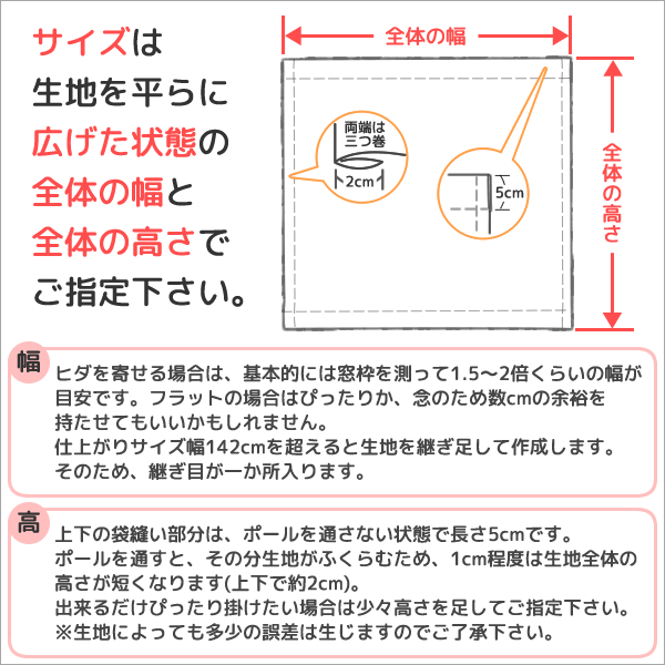 生地につっぱりポールを通してつっぱるだけ。カーテンレールは不要ですし、壁に穴を開けずに設置できますので 賃貸住宅でも気軽に取り付けることができます。 1cm単位でサイズをご指定できます。