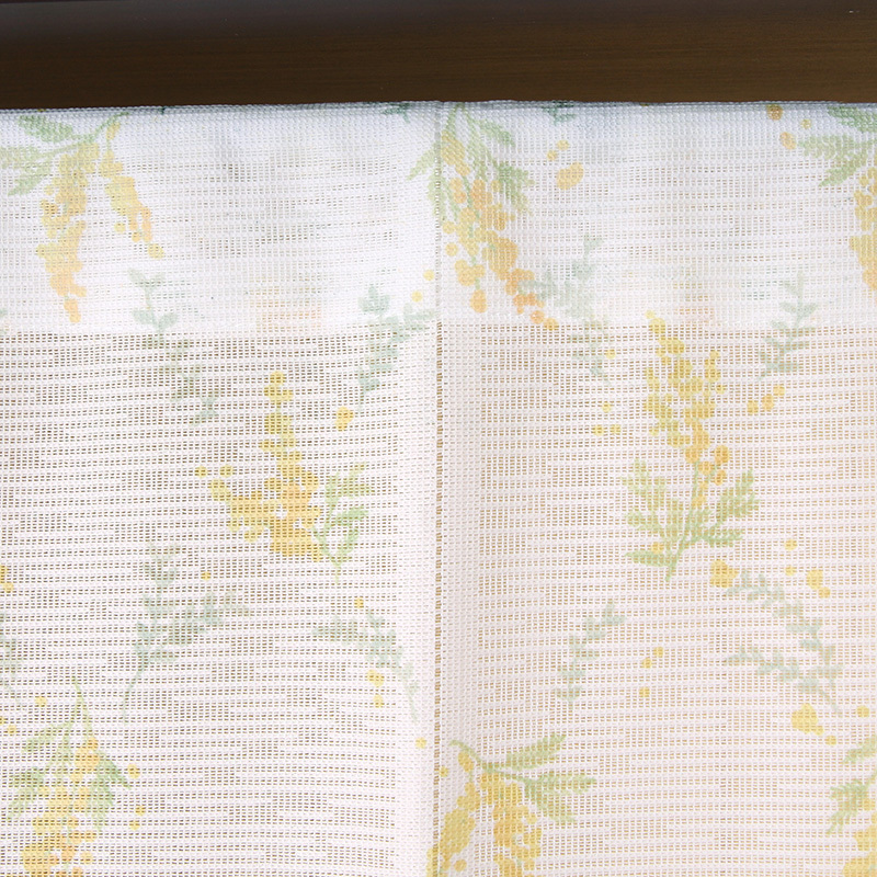 | 店長より | 当店スタッフデザインのオリジナル柄プリントのれんです。 黄色い花が鮮やかなミモザをモチーフにした柄です。国によってずいぶん花言葉の意味が違うようです。 【生地の特徴】透け感のあるレース地に片面プリントしています。生地の向こうの様子が少々透けて見えます。 【中割れ】中央はジョイントされていますがはさみでカットできます。 | ||